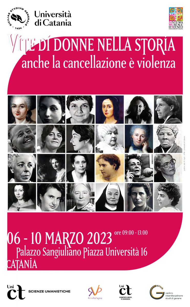 Lunedì 6 marzo alle ore 10.00, presso la sala espositiva di Palazzo Sangiuliano, Piazza Università, sarà inaugurata la mostra "Vite di donne nella storia. Anche la cancellazione è violenza”, a cura del collettivo femminista RivoltaPagina in collaborazione con il Centro Studi di Genere GENUS del Dipartimento di Scienze Umanistiche, la Prof.ssa Adriana Di Stefano, Delegata del Rettore per le Pari opportunità, il Sistema Museale di Ateneo e il Comitato Unico di Garanzia.