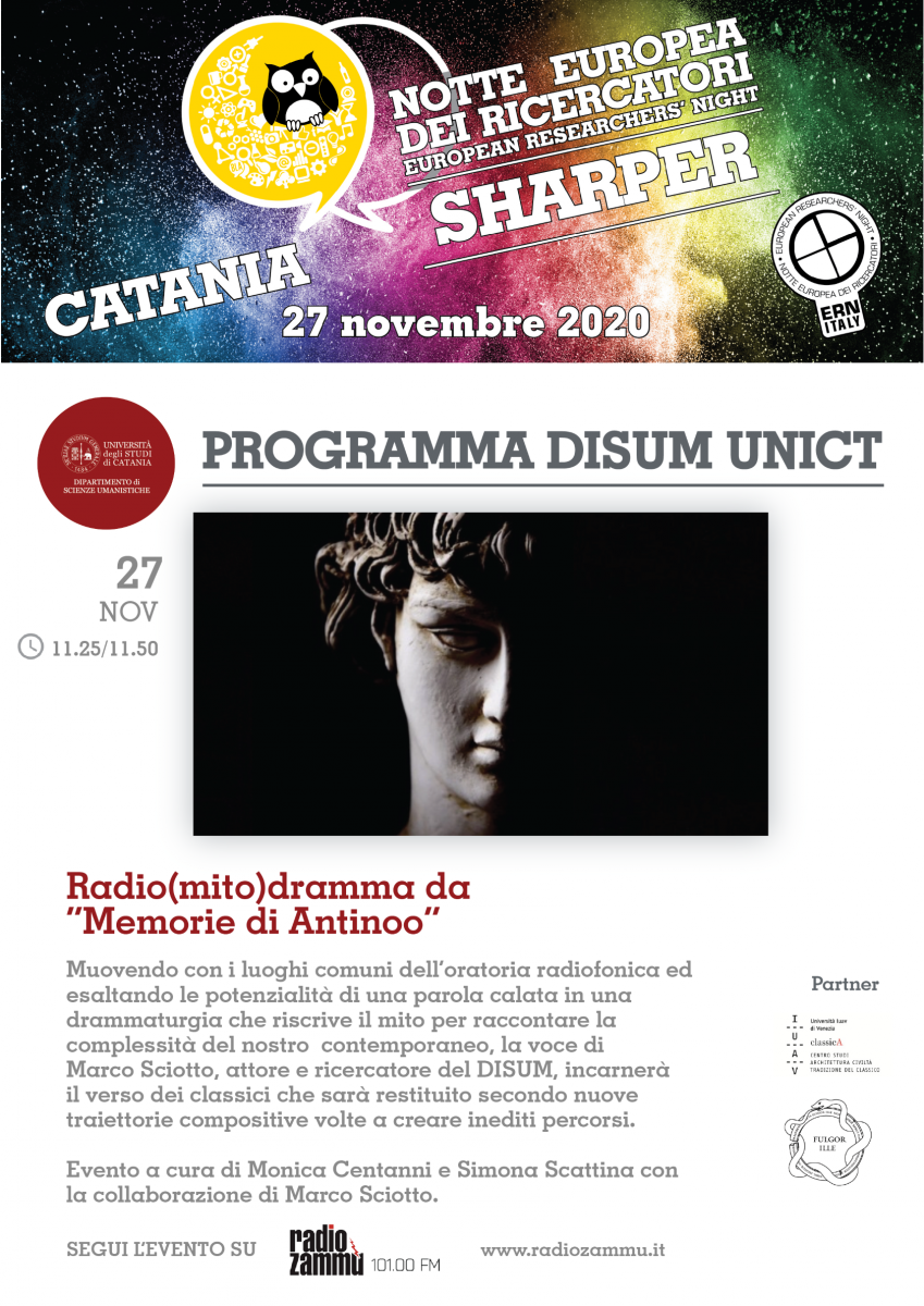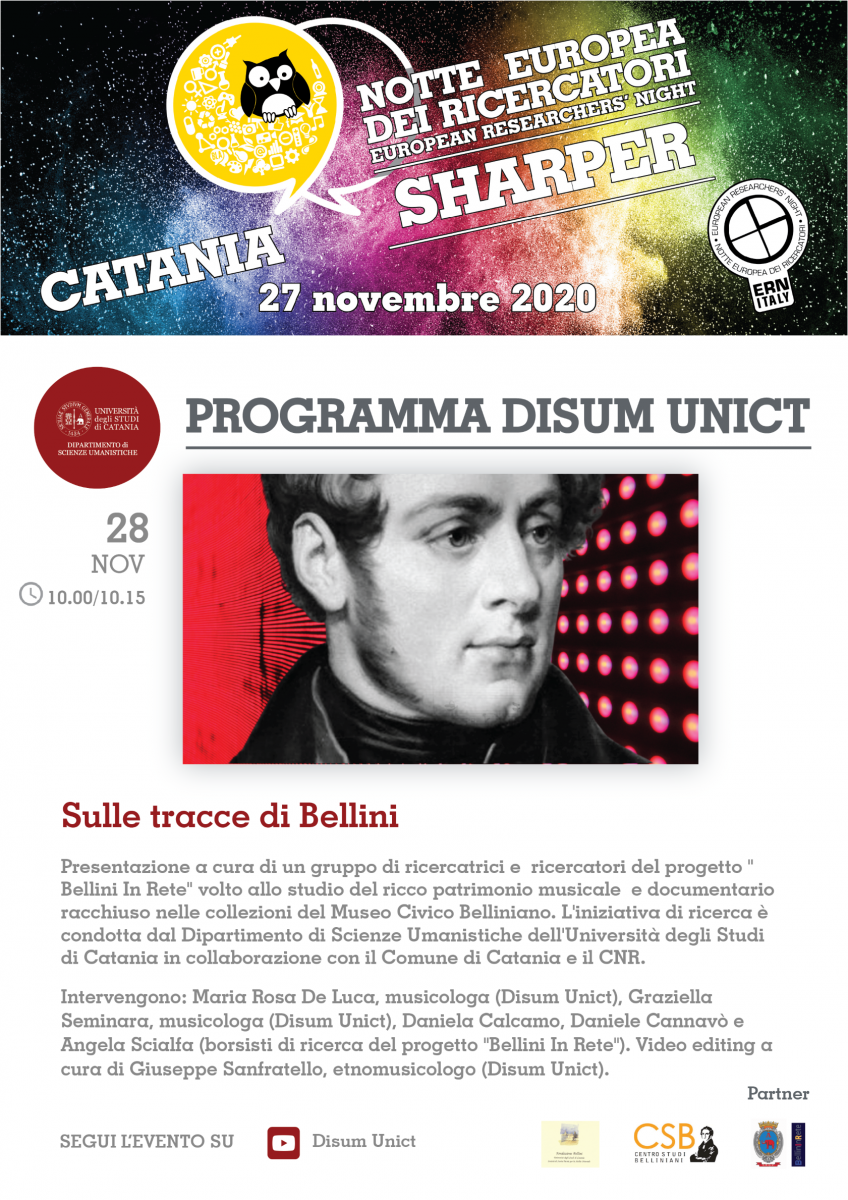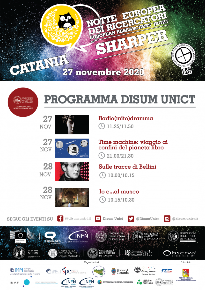 Il 27 e il 28 novembre il nostro dipartimento prenderà parte all'importante appuntamento europeo della Notte dei ricercatori 2020 - sharper night 2020 con quattro iniziative (che trovate nella locandina qui allegata e nel programma on line cliccando qui). Vi invitiamo a partecipare, a condividere gli eventi sui vostri social e a dare tutto l'appoggio possibile a queste iniziative. Seguite le pagine e gli account social del DISUM qui di seguito elencati e segnalate gli eventi utilizzando gli hashtag uffiiciali #SharperNight #EuropeanResearchersNight #ERN20 #MSCANight #ERNItaly #SharperNightCatania e taggando la pagina @sharper-night