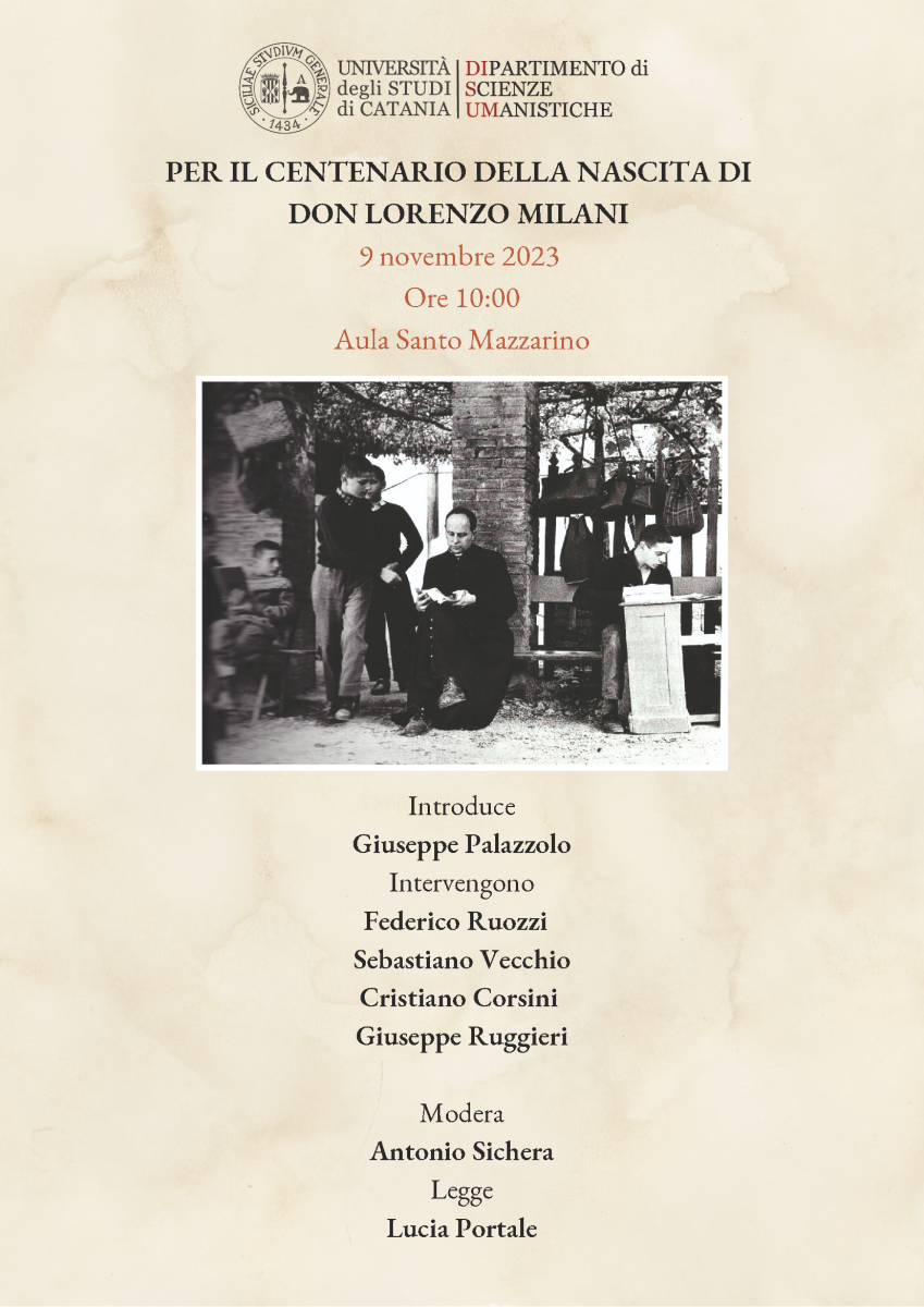 Don Lorenzo Milani ha segnato la seconda metà del Novecento. Giovedì 9 novembre, nell’aula magna Santo Mazzarino, dalle 10 alle 12, ne parlano Cristiano Corsini, Giuseppe Ruggieri, Federico Ruozzi e Sebastiano Vecchio; introduce Giuseppe Palazzolo, coordina Antonio Sichera, legge Lucia Portale. Più che un seminario per studiosi, l’incontro sarà un’occasione di prima conoscenza. Inframmezzati dalle sue parole, gli interventi faranno luce su vari aspetti della sua personalità controversa che continua a far discutere.