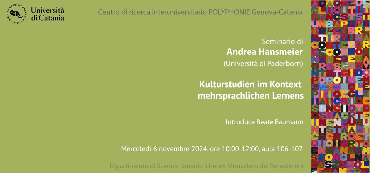 La prof.ssa Andrea Hansmeier (Universität Paderborn) terrà un seminario dal titolo Kulturstudien im Kontext mehrsprachlichen Lernens. Il seminario avrà luogo mercoledì 6 novembre 2024 alle ore 10:00 in aula 106-107.
