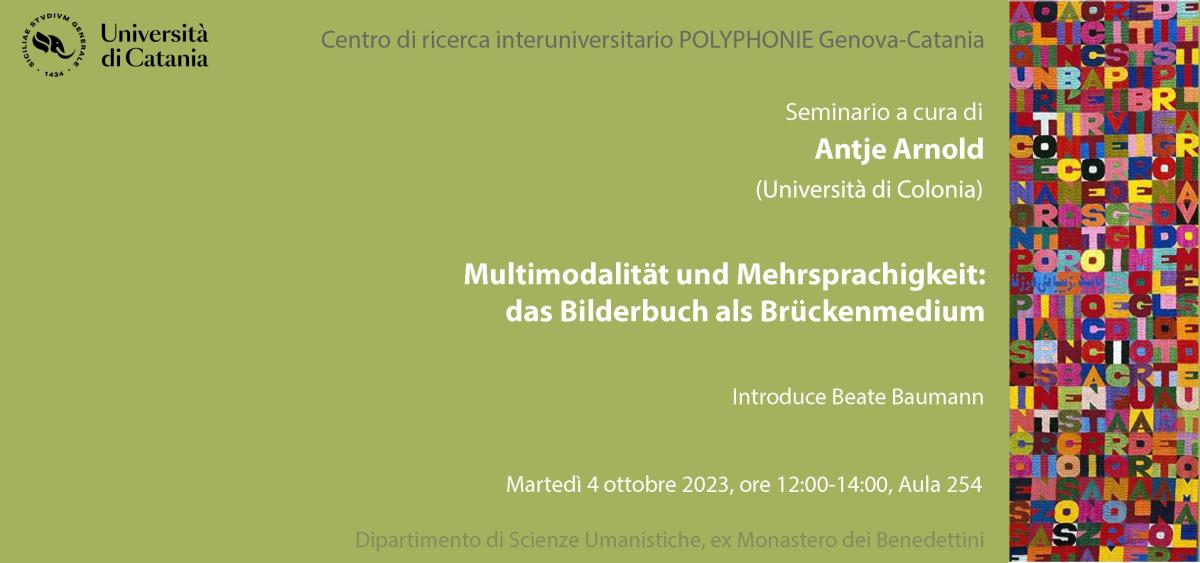 La prof.ssa Antje Arnold (Universität zu Köln) terrà un seminario dal titolo Multimodalität und Mehrsprachigkeit - das Bilderbuch als Brückenmedium. Il seminario che rientra nelle attività del Centro di Ricerca Interuniversitario POLYPHONIE.