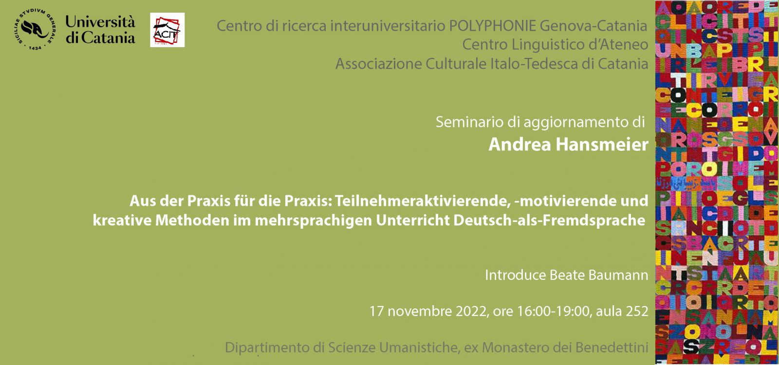 Il seminario che rientra nelle attività del Centro di Ricerca Interuniversitario POLYPHONIE (in collaborazione con il Centro Linguistico d’Ateneo e l’Associazione Italo-Tedesca di Catania) è destinato a docenti di tedesco che operano nelle scuole superiori e a livello universitario.