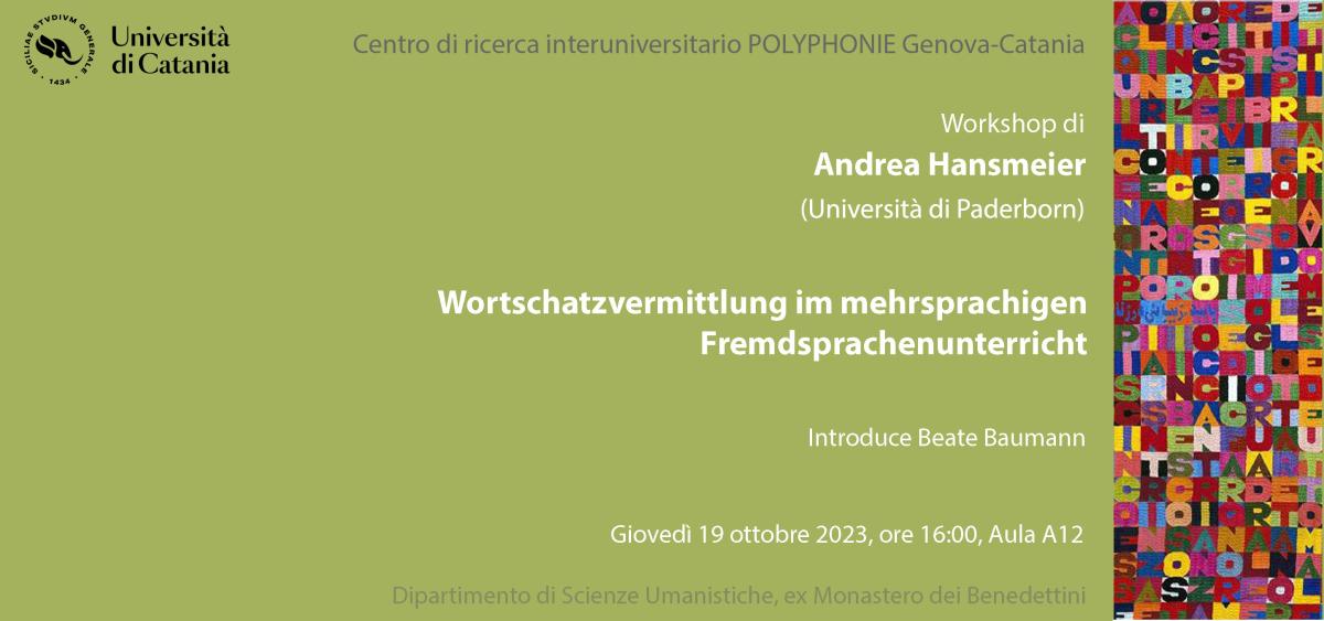 La prof.ssa Andrea Hansmeier (Universität Paderborn) terrà un workshop dal titolo Wortschatzvermittlung im mehrsprachigen Fremdsprachenunterricht.