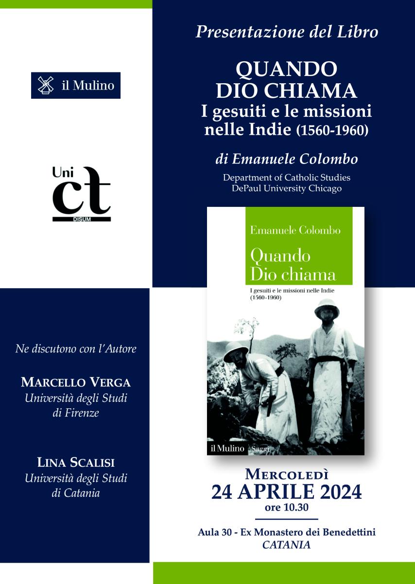 Mercoledì 24 aprile, ore 10:30, nell'aula 30 del Monastero dei Benedettini, si terrà la presentazione del volume "Quando Dio chiama. I Gesuiti e le missioni nelle Indie (1560-1960)", il nuovo libro di Emanuele Colombo (Department of Catholic Studies - DePaul University Chicago).