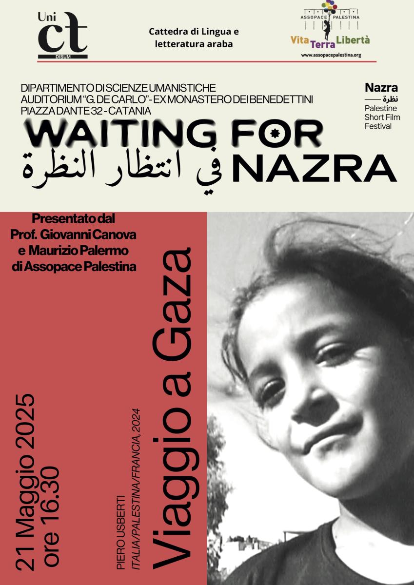 La cattedra di arabo del Dipartimento di Scienze Umanistiche dell’Università di Catania, in collaborazione con Nazra Palestine Short Film Festival e Assopace Palestina, presenta in anteprima a Catania il film Viaggio a Gaza, del regista italiano Piero Usberti, mercoledì 21 maggio alle ore 16.30 presso l'Auditorium "G. De Carlo" dell'ex Monastero dei Benedettini.
