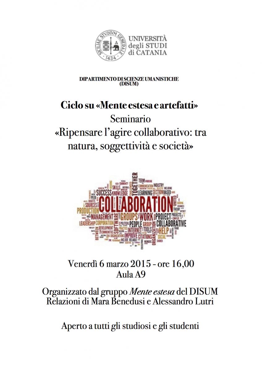 Venerdì 6.3.2015 alle 16,00 nell'aula A9 si svolgerà un seminario nell'ambito del ciclo su «Mente estesa e artefatti». Mara Benedusi e Alessandro Lutri si occuperanno di Ripensare l'agire collaborativo: tra natura, soggettività e società .