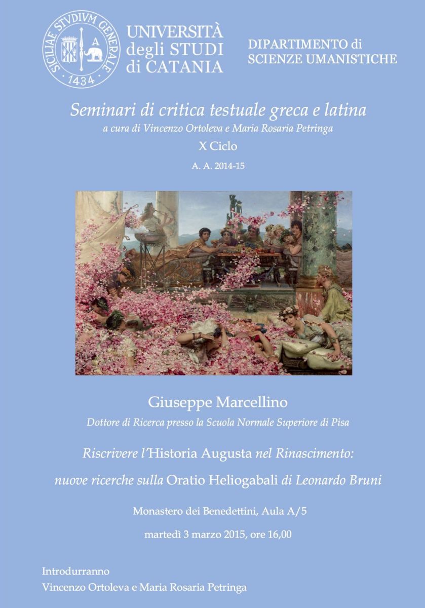 Martedì 3.3.2015 alle 16,00 nell'aula A5 Giuseppe Marcellino (Scuola Normale Superiore di Pisa) terrà un seminario dal titolo Riscrivere l'Historia Augusta nel Rinascimento: nuove ricerche sulla Horatio Eliogabali di Leonardo Bruni.