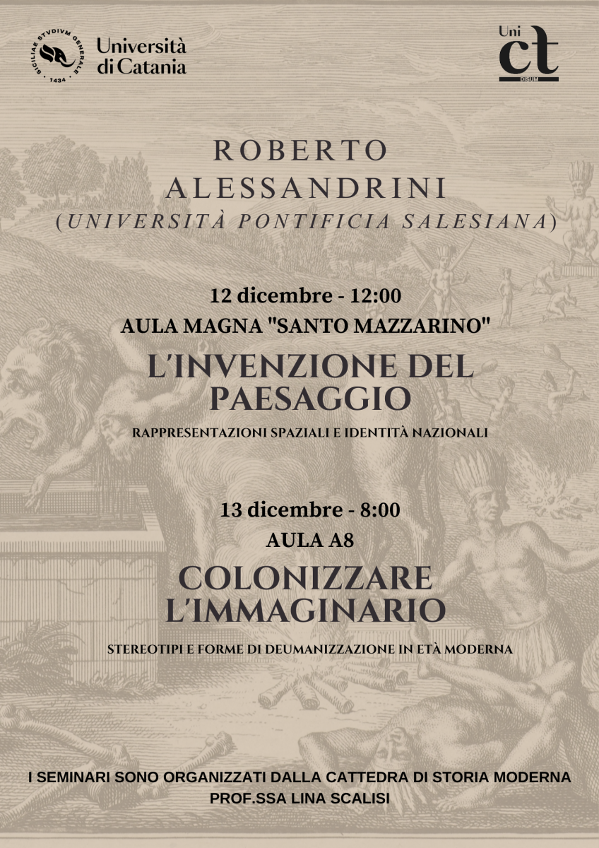 Il Prof. Roberto Alessandrini (Università Pontificia Salesiana) terrà due seminari. Il primo, L'invenzione del paesaggio. Rappresentazioni spaziali e identità nazionali, si svolgerà giovedì 12 dicembre alle 12:00 in Aula Magna "Santo Mazzarino".
