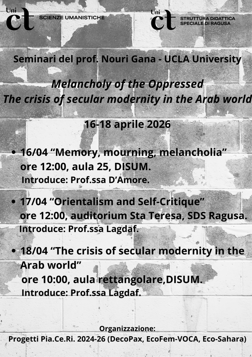 Dal 16 al 18 Aprile 2026, si terranno seminari del Prof. Nouri Gana (UCLA University), dal titolo "Melancholy of the Oppressed: The crisis of secular modernity in Arab world".