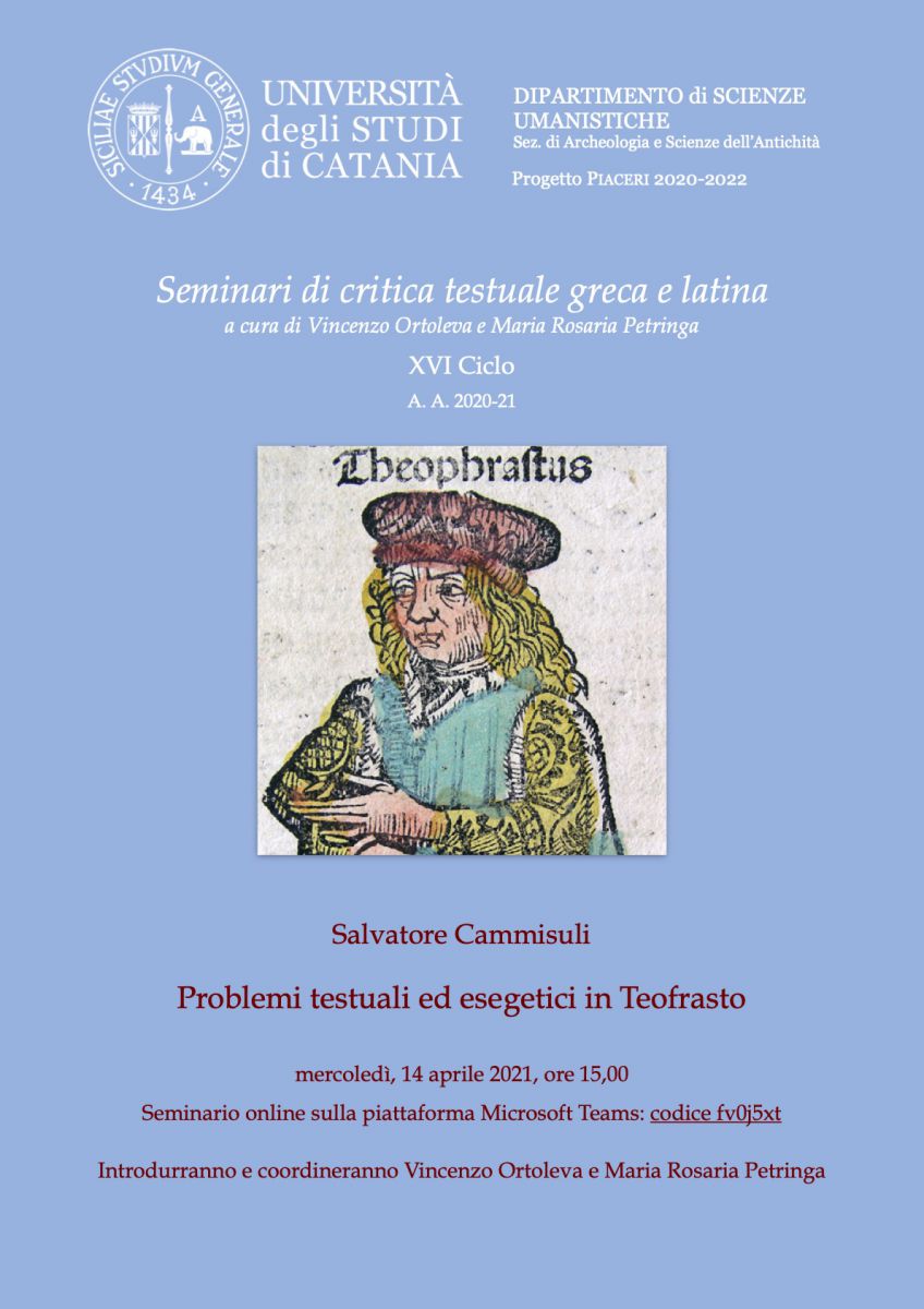 Mercoledì 14 aprile p. v. alle ore 15,00, nell’ambito dei “Seminari di critica testuale greca e latina” (XVI ciclo), Salvatore Cammisuli terrà un seminario dal titolo “Problemi testuali ed esegetici in Teofrasto”.