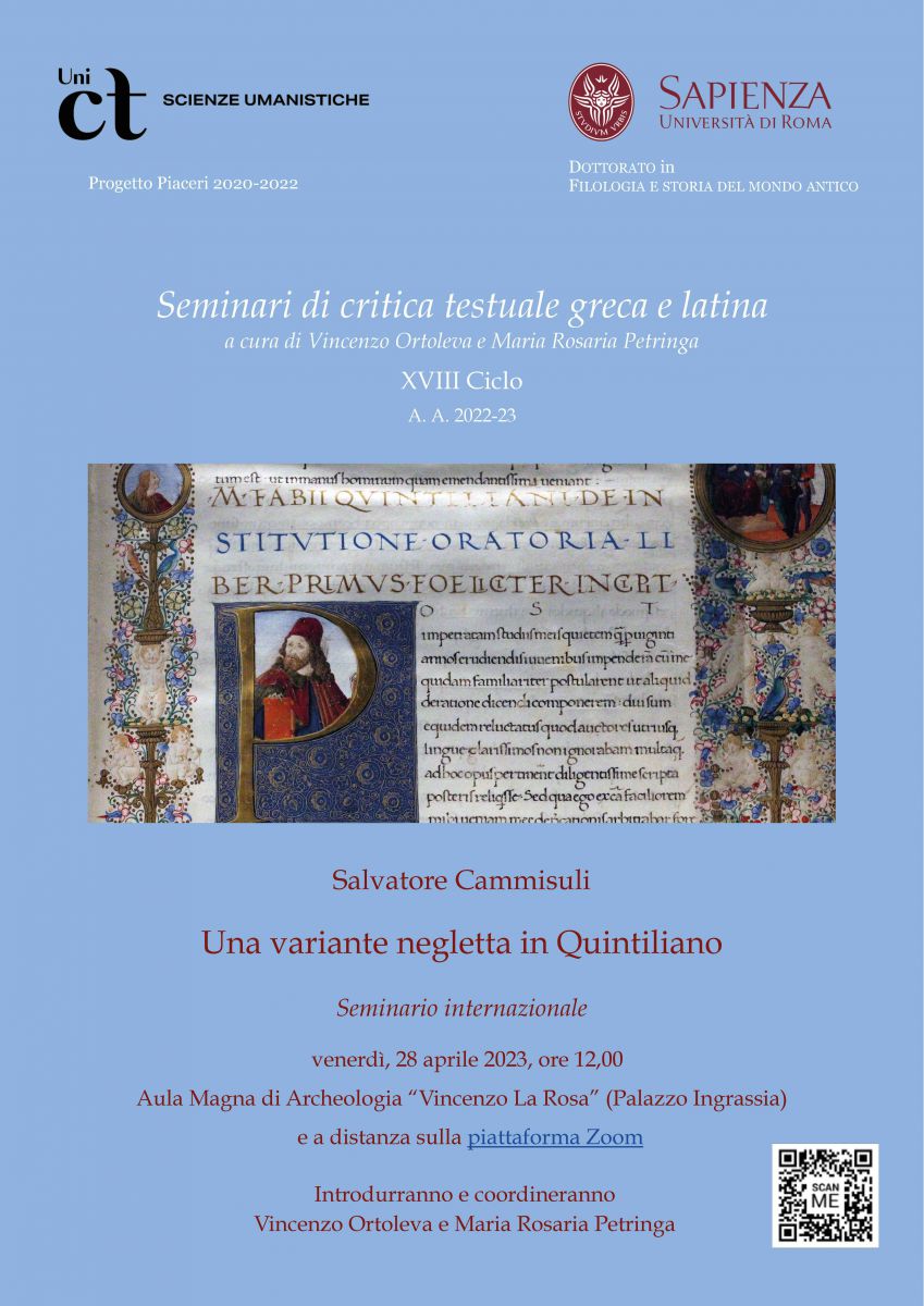 Venerdì 28 aprile 2023 alle ore 12,00, nell’Aula Magna di Archeologia “Vincenzo La Rosa" (Palazzo Ingrassia), nell’ambito dei “Seminari di critica testuale greca e latina” (XVIII ciclo), il Dott. Salvatore Cammisuli terrà un seminario dal titolo “Una variante negletta in Quintiliano". Introdurranno e coordineranno Vincenzo Ortoleva e Maria Rosaria Petringa.