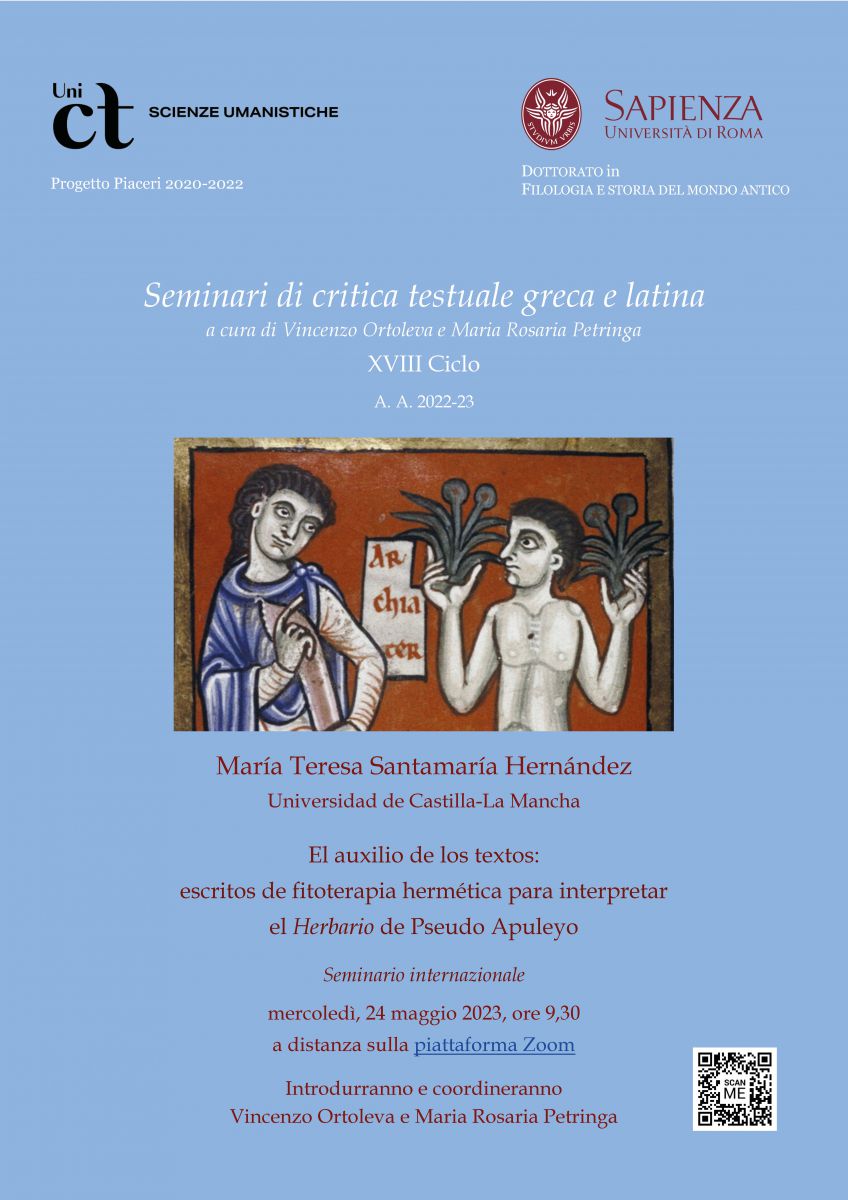 Mercoledì 24 maggio 2023 alle ore 9,30, nell’ambito dei “Seminari di critica testuale greca e latina” (XVIII ciclo), la Prof.ssa María Teresa Santamaría Hernández (Universidad de Castilla-La Mancha) terrà un seminario dal titolo El auxilio de los textos: escritos de fitoterapia hermética para interpretar el "Herbario" de Pseudo Apuleyo. Introdurranno e coordineranno Vincenzo Ortoleva e Maria Rosaria Petringa.
