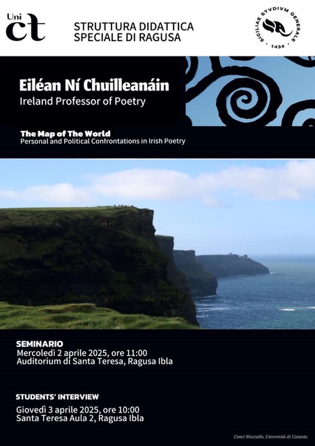 Si comunica che mercoledì 2 aprile, alle ore 11:00 presso l'Auditorium di Santa Teresa della SDS di Ragusa, si terrà il seminario di Eiléan Ní Chuilleanáin, Ireland Professor of Poetry 2016-19, intitolato “The Map of the World. Personal and Political Confrontations in Irish Poetry”.