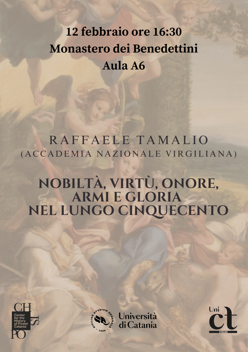 Giovedì 12 febbraio Raffaele Tamalio (Accademia Nazionale Virgiliana) terrà un seminario dal titolo Nobiltà, virtù, onore, armi e gloria nel lungo Cinquecento.