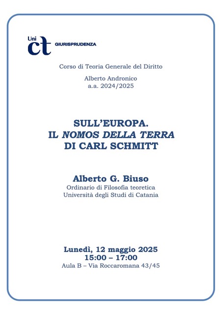 Nell’ambito del Corso di Teoria generale del Diritto del Dipartimento di Giurisprudenza Unict, del quale è titolare il Prof. Alberto Andronico, Alberto Giovanni Biuso terrà una lezione dedicata a Carl Schmitt. L’evento si terrà nell’Aula B di via Roccaromana, dalle 15.00 alle 17.00.
