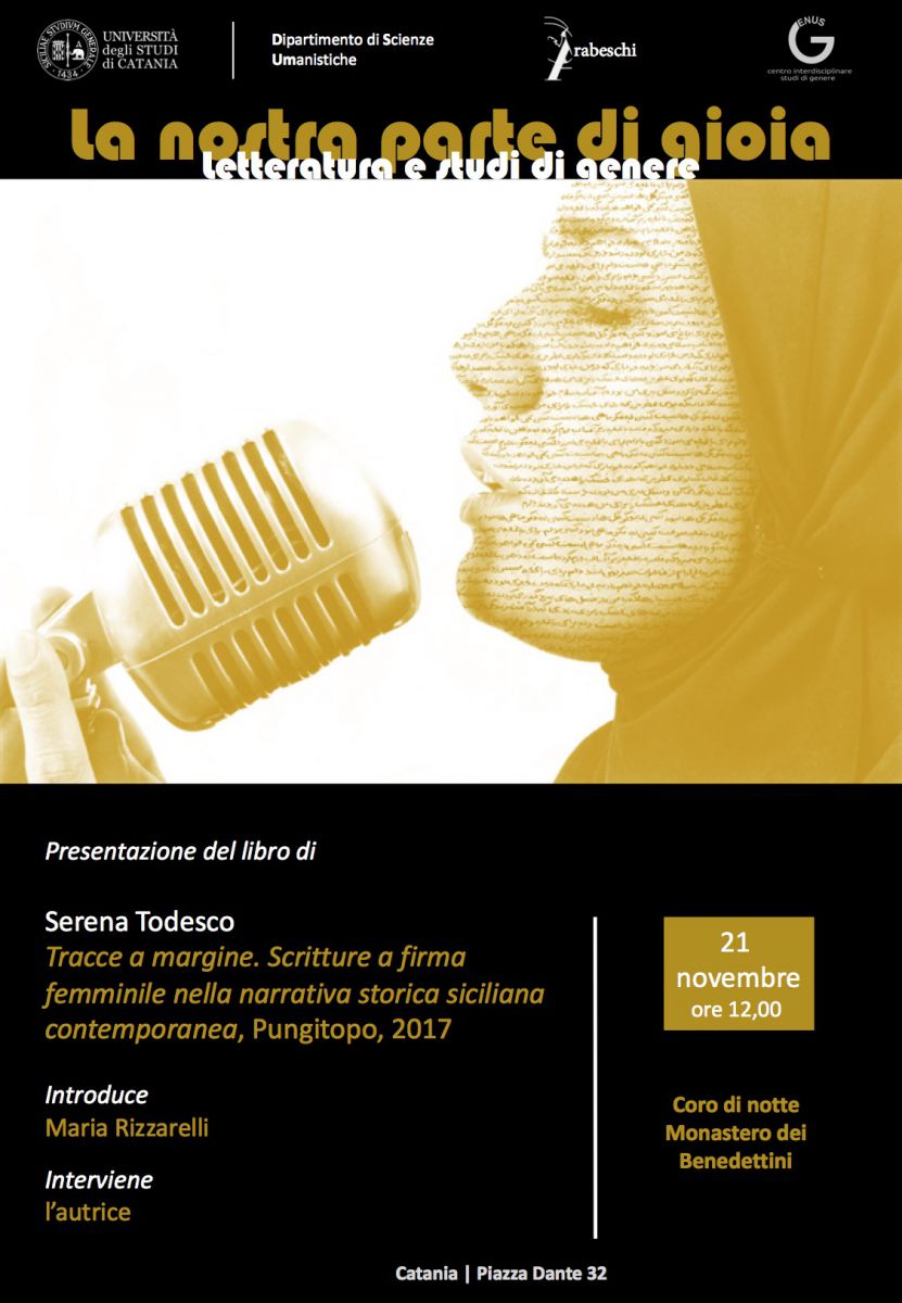Martedì 21.11.2017 alle 12,00 nel Coro di Notte sarà presentato il libro di Serena Todesco Tracce a margine. Scritture a firma femminile nella narrativa storica siciliana contemporanea (Pungitopo, 2017).
