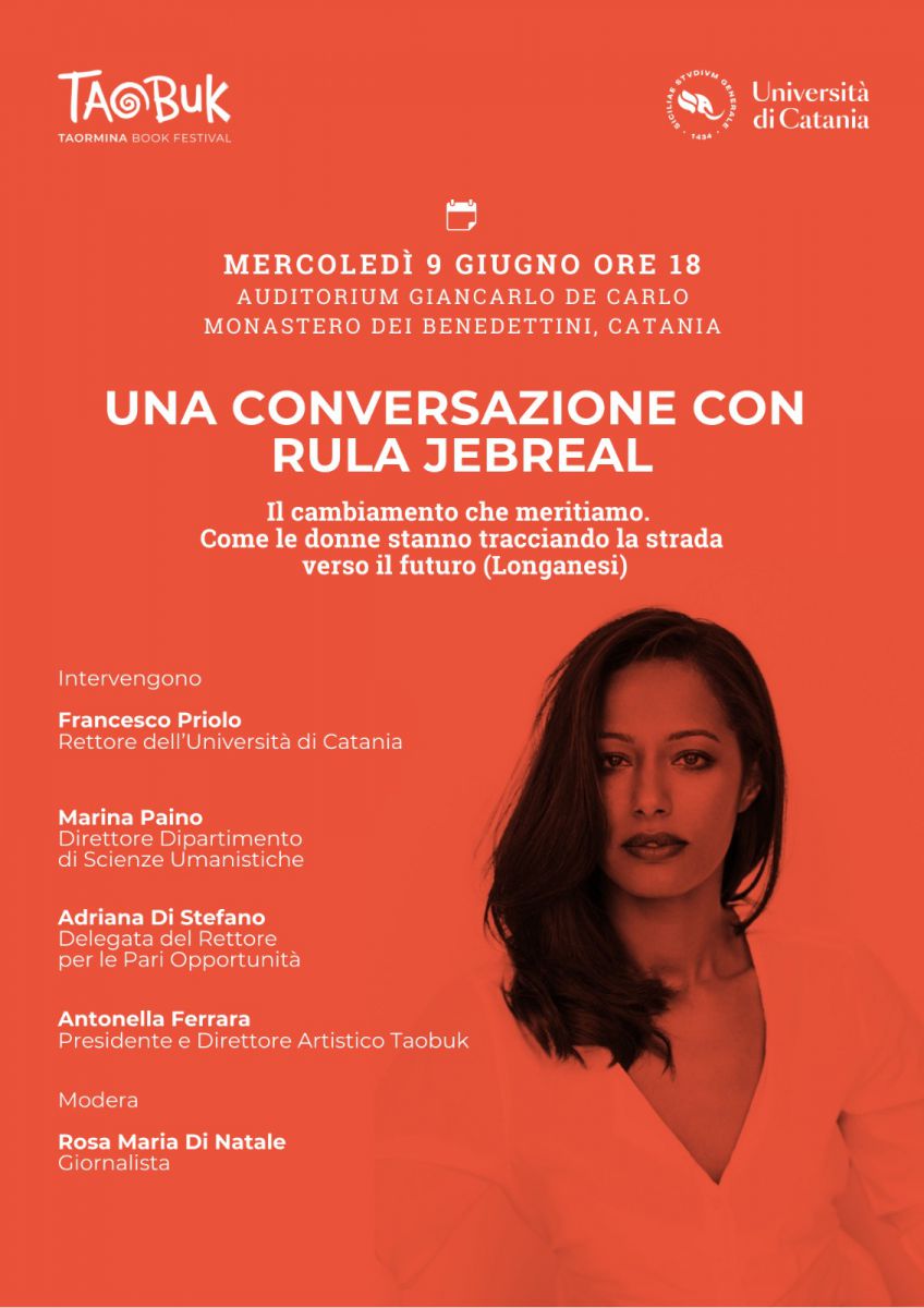 Mercoledì 9 giugno 2021, ore 18.00, nell’auditorium “De Carlo” del Monastero dei Benedettini, il Dipartimento di Scienze umanistiche dell’Università di Catania ospiterà, in collaborazione con Taobuk, una conversazione con Rula Jebreal, giornalista, scrittrice e conduttrice televisiva italo-israeliana di origine palestinese, che prenderà spunto dal suo ultimo libro, “Il cambiamento che meritiamo” (Milano, Longanesi, 2021).