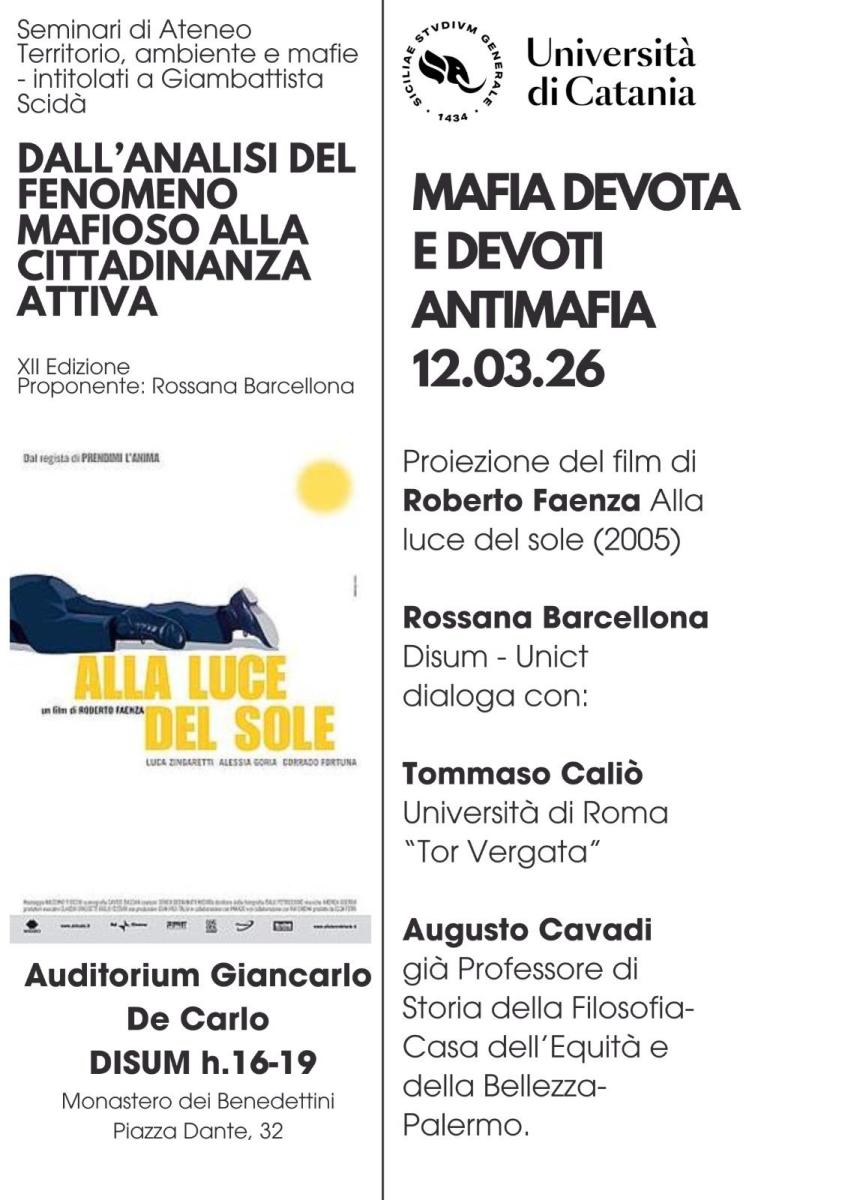 Giovedi' 12 marzo alle ore 16, presso l'Auditorium G. DeCarlo, si terrà il IV incontro della XII EDIZIONE dei Seminari Interdipartimentali su Territorio, ambiente e mafie - intitolati a Giambattista Scidà, dal titolo Mafia devota e Devoti antimafia.