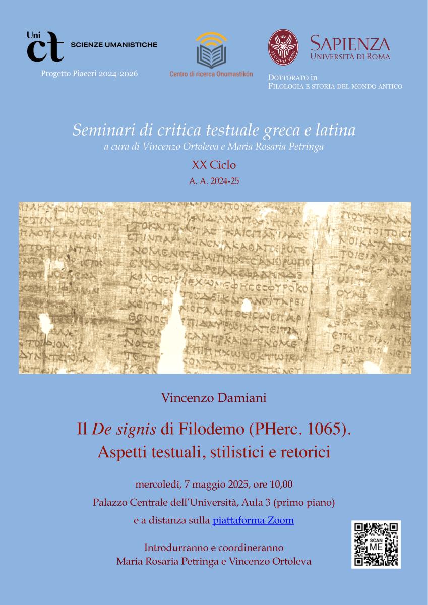 Mercoledì, 7 maggio 2025 alle ore 10,00, nell’Aula 3 del Palazzo Centrale dell'Università e a distanza sulla Piattaforma Zoom, nell’ambito dei “Seminari di critica testuale greca e latina” (XX ciclo), il Dott. Vincenzo Damiani terrà un seminario dal titolo "Il De signis di Filodemo (PHerc. 1065). Aspetti testuali, stilistici e retorici". Introdurranno e coordineranno Maria Rosaria Petringa e Vincenzo Ortoleva.