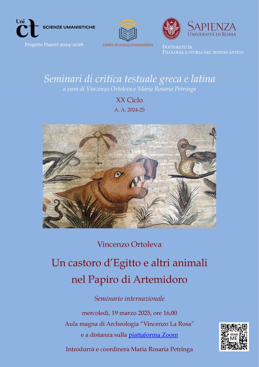 Mercoledì 19 marzo 2025 alle ore 16:00, nell’Aula magna di Archeologia “Vincenzo La Rosa” e a distanza sulla Piattaforma Zoom, nell’ambito dei “Seminari di critica testuale greca e latina” (XX ciclo), il Prof. Vincenzo Ortoleva terrà un seminario dal titolo "Un castoro d’Egitto e altri animali nel Papiro di Artemidoro".