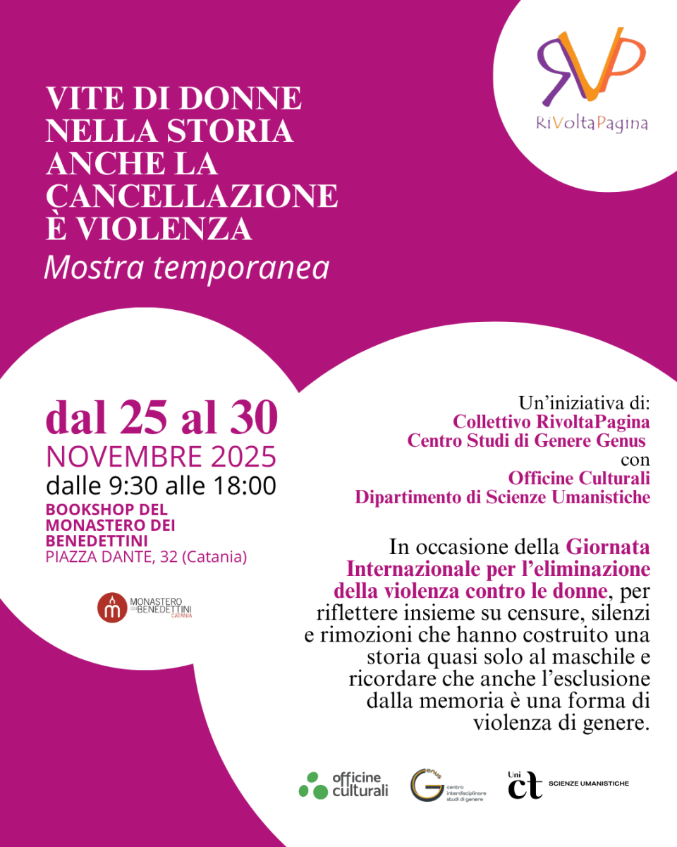 L’iniziativa del Collettivo RivoltaPagina e del Centro Studi di Genere Genus, con Officine Culturali e il Dipartimento di Scienze Umanistiche, si svolge in occasione della Giornata Internazionale per l’eliminazione della violenza contro le donne. Officine Culturali ha scelto di sostenere questa iniziativa perché dare voce alle storie dimenticate delle donne significa restituire profondità al nostro patrimonio culturale, rafforzare una cultura del rispetto e compiere un passo indispensabile verso una comunità più consapevole.
