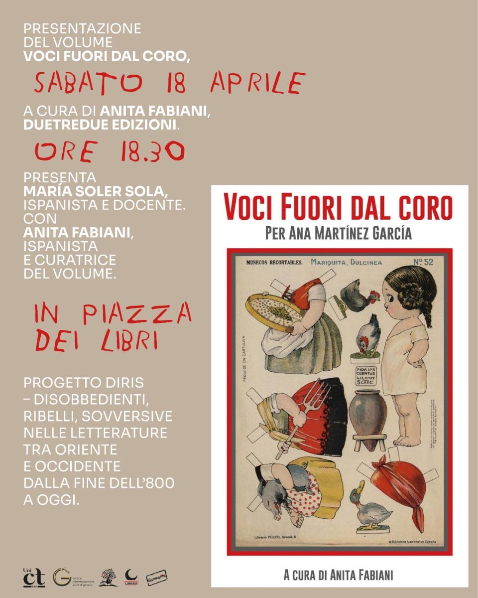 Sabato 18 aprile, alle 18.30, presso Gammazita (Piazza Federico di Svevia 90-94), si terrà la presentazione di Voci fuori dal coro, a cura di anita fabiani (Duetredue Edizioni), con María Soler Sola.