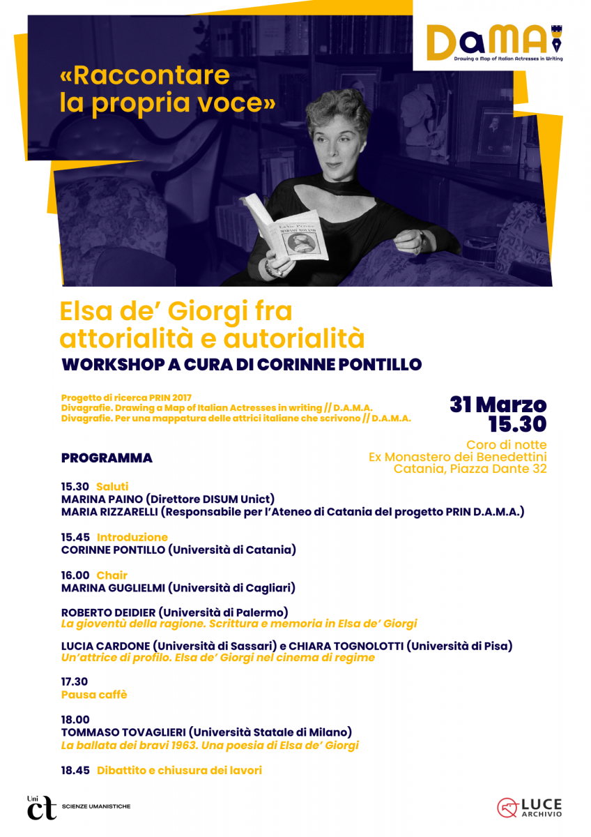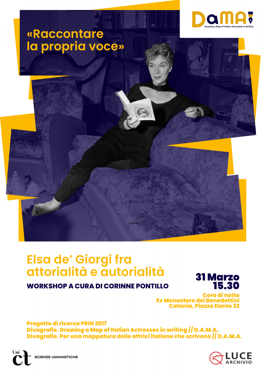 Diva del cinema italiano degli anni Trenta, Elsa de’ Giorgi è stata anche, e per un lungo arco di tempo, una scrittrice. Finora poco esplorata dalla critica, la sua produzione, posta al confine tra letteratura e visual culture, trova attraverso la prospettiva della ‘divagrafia’ nuove possibilità di indagine. Ed è proprio a partire da tali premesse teoriche che il workshop «Raccontare la propria voce». Elsa de’ Giorgi fra attorialità e autorialità, a cura di Corinne Pontillo, metterà in luce, grazie agli interventi delle relatrici e dei relatori coinvolti, la natura eterogenea delle espressioni autoriali e del profilo artistico dell’attrice.