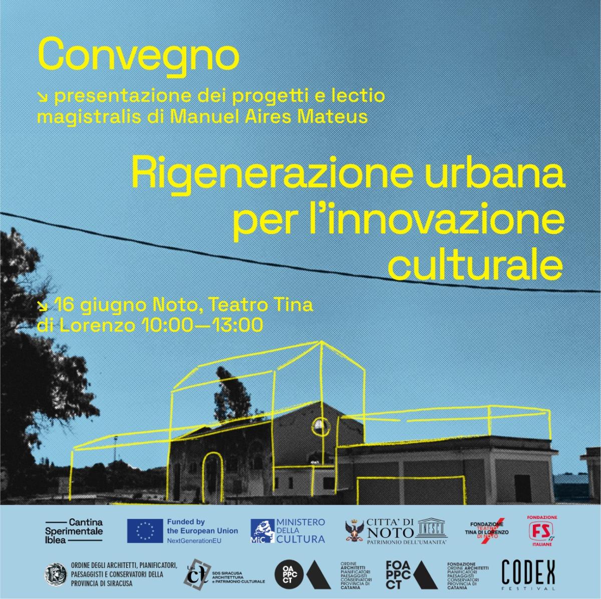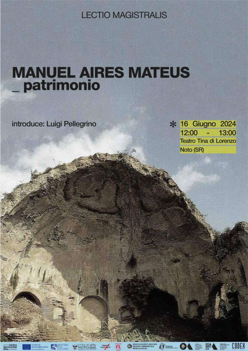 Il workshop Rigenerazione urbana per l'innovazione culturale (24-26 maggio; 8, 14-16 giugno) terminerà con un convegno a Noto al Teatro "Tina di Lorenzo" con una presentazione degli esiti e una Lectio Magistralis di Manuel Aires Mateus (Lisbona) dal titolo "Patrimonio".