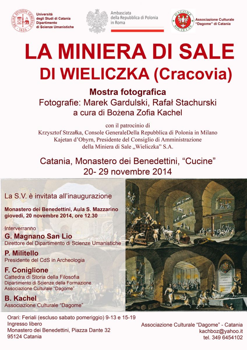 «L'esposizione avrà per oggetto la storica miniera di sale situata nell'area metropolitana di Cracovia, l'unica al mondo ad essere conservata in condizioni praticamente perfette. Wieliczka è stata dichiarata Patrimonio dell'Umanità dall'Unesco per la sua miniera di sale profonda oltre 320 metri con gallerie che superano i 300 chilometri. Le fotografie ci offriranno un percorso guidato per ammirare antichi strumenti per l'estrazione e la lavorazione del sale, oltre a stanze e cappelle scolpite direttamente nel sale, come la Cappella di Santa Kinga, dove sono esposti un bassorilievo raffigurante il Cenacolo di Leonardo da Vinci e altre statue -sempre di sale- e la sala concerti, dove si organizzano importanti spettacoli. L'evento è organizzato dall'Associazione Culturale "Dagome" in collaborazione con l'Ufficio Consolare dell'Ambasciata della Repubblica di Polonia in Italia e con l'Università degli Studi di Catania - Dipartimento di Scienze Umanistiche. La mostra sarà ospitata nelle "Cucine" del Monastero dei Benedettini fino al 29 novembre e avrà l'ingresso libero».