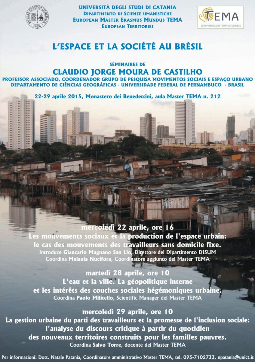 Da mercoledì 22 a mercoledì 29.4.2015 nell'aula Master TEMA n. 212 Claudio Jorge Moura de Castilho (Università di Pernambuco) terrà un ciclo di seminari dal titolo complessivo L'espace et la socià©tà© au Brà©sil. Gli incontri si svolgono nell'à mbito delle iniziative del Master Erasmus Mundus TEMA (Territori Europei).