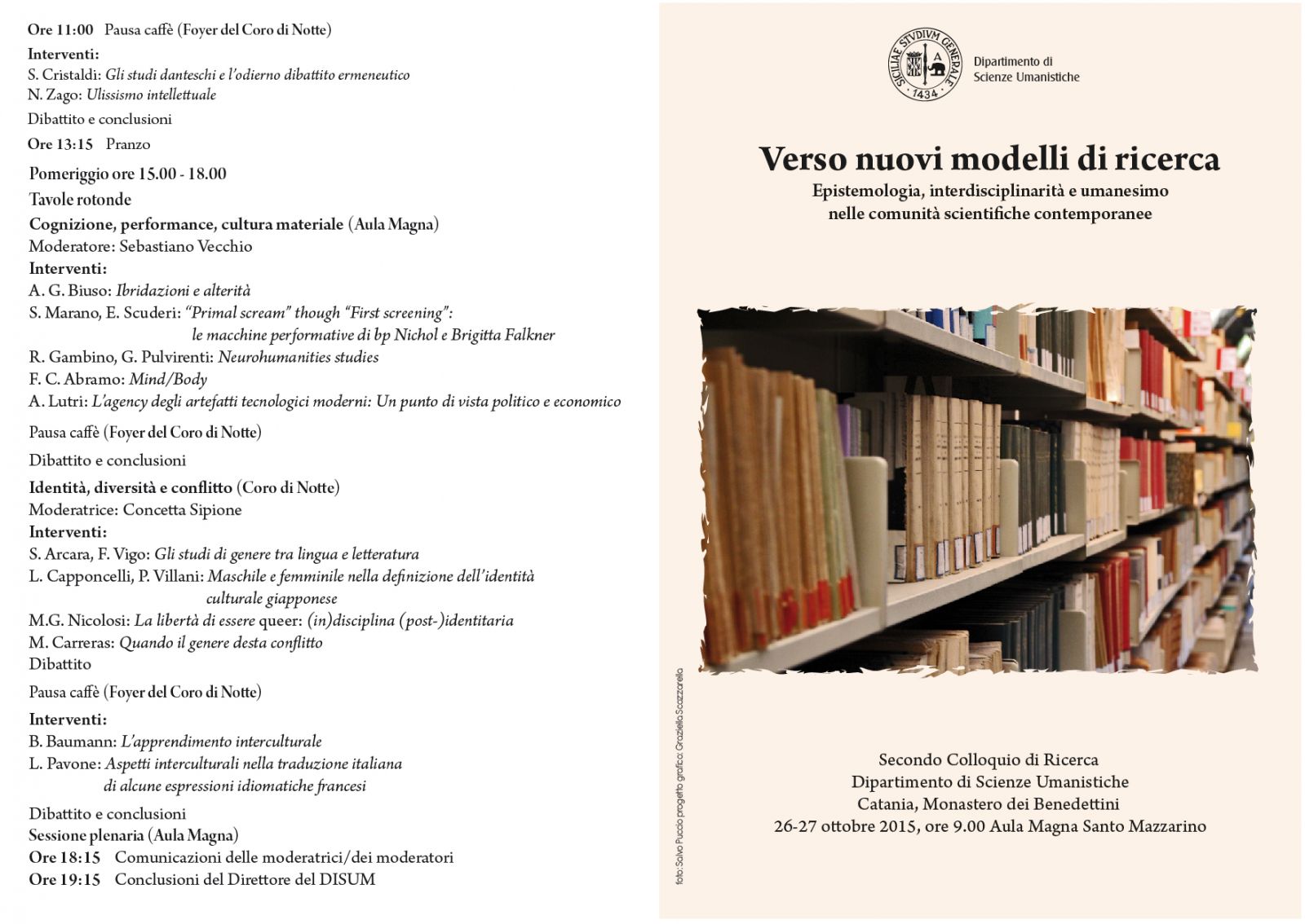 Lunedì 26 e martedì 27 ottobre 2015 si svolgerà il Secondo Colloquio di Ricerca del Dipartimento di Scienze Umanistiche, dal titolo Verso nuovi modelli di ricerca. Epistemologia, interdisciplinarità e umanesimo nelle comunità scientifiche contemporanee.