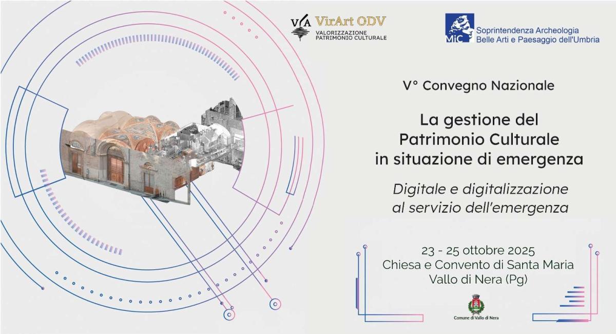 L’Associazione VirArt, in collaborazione con la Soprintendenza Archeologia Belle Arti e Paesaggio dell’Umbria, celebra nel 2025 il primo lustro di lavori del Convegno “La gestione del patrimonio culturale in situazione di emergenza”. L’edizione di quest’anno, che avrà luogo dal 23 al 25 ottobre 2025 negli spazi del Complesso di S. Maria a Vallo di Nera (PG), abbraccia un argomento vasto, ed è volontà degli organizzatori quella di raccogliere il maggior numero di input su come la tecnologia digitale abbia cambiato, stia cambiando o cambierà la gestione delle emergenze.