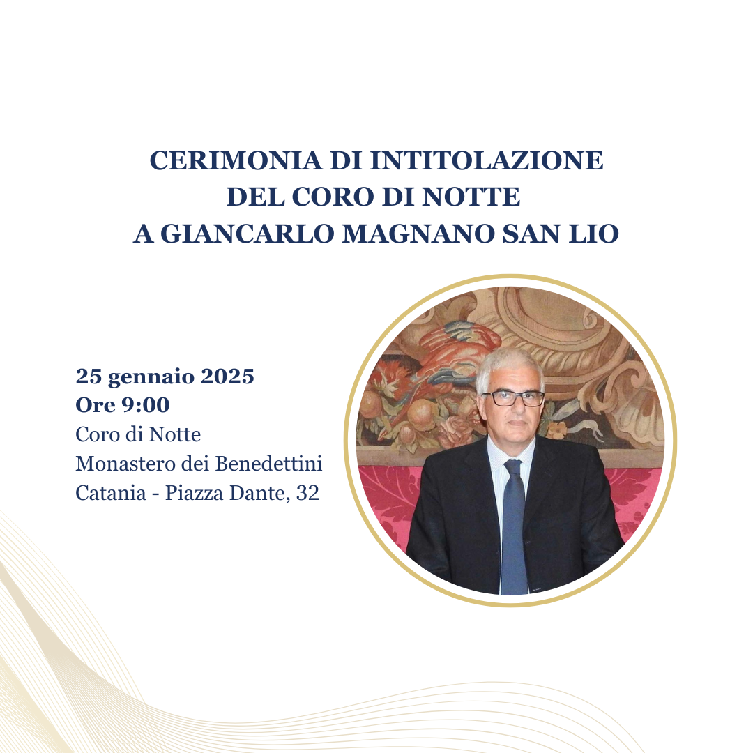 Sabato 25 gennaio 2025, alle ore 9:00, avrà luogo presso il Monastero dei Benedettini la cerimonia di intitolazione del Coro di Notte a Giancarlo Magnano San Lio, professore ordinario di Storia della filosofia, già Direttore del Dipartimento di Scienze Umanistiche, già Prorettore dell'Università degli Studi di Catania.
