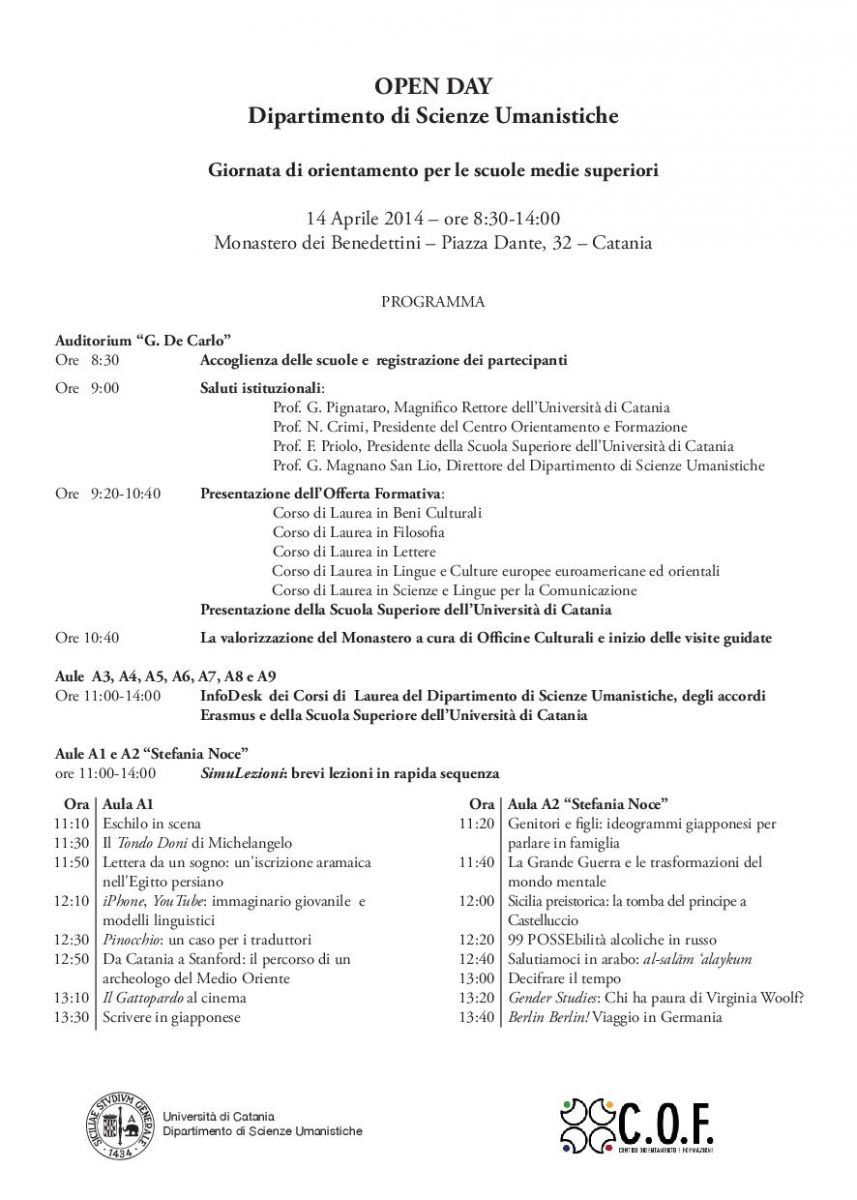a) la prima parte (sino alle 11) si svolgerà nell'Auditorium G. De Carlo; sono previsti i saluti del Magnifico Rettore, del Presidente del Centro Orientamento e Formazione, del Presidente della Scuola Superiore, del Direttore del Disum.