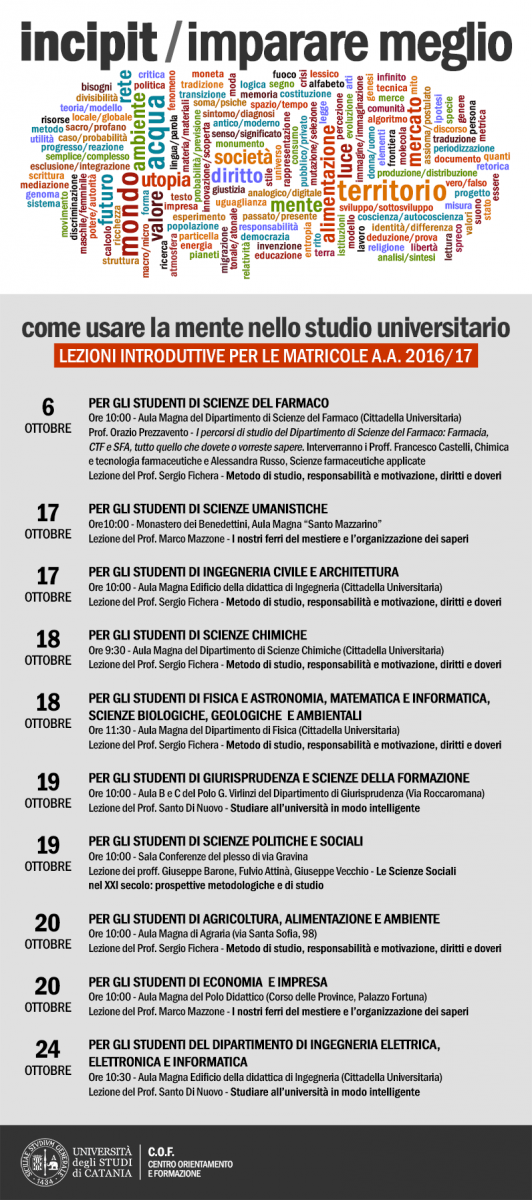 Giovedì 6.10.2016 prende il via il secondo ciclo di lezioni dedicate alle matricole dell'a.a. 2016/17, intitolate Incipit / Imparare meglio: come usare la mente nello studio universitario.