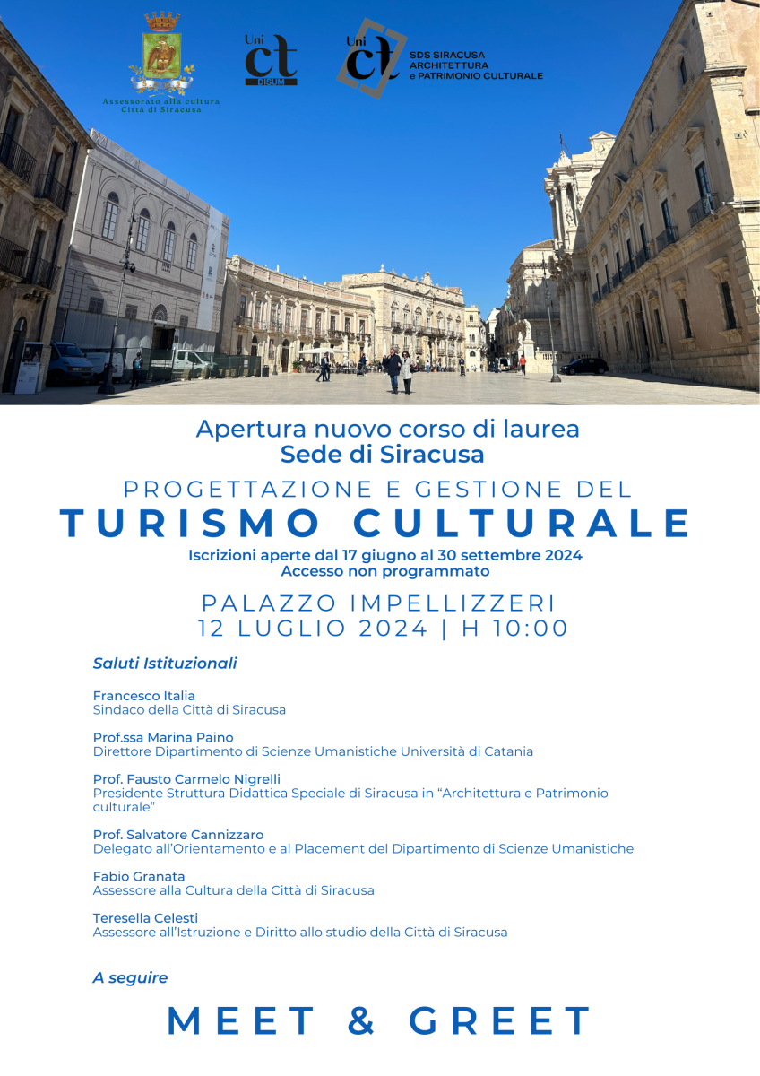 Siamo lieti di annunciare l'apertura del nuovo corso di laurea in Progettazione e gestione del turismo culturale, che avrà sede a Siracusa.