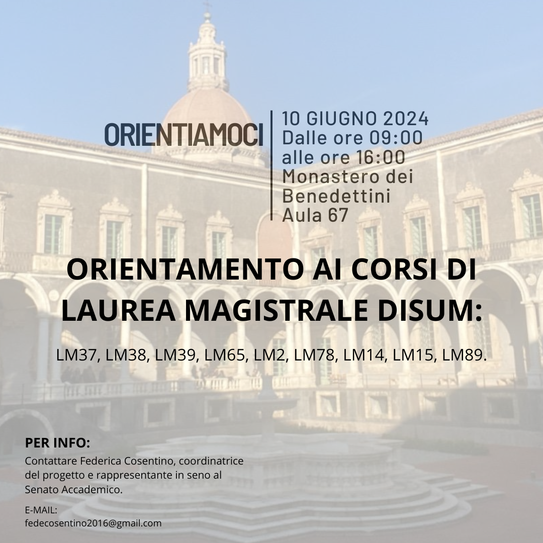Lunedì 10 giugno 2024, a partire dalle ore 9:00 alle ore 16:00, presso l'aula 67, si terrà la presentazione dei Corsi di Laurea Magistrale del Dipartimento di Scienze Umanistiche.